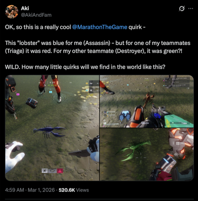번지의 새로운 추출 슈터 Marathon 가 서버 슬램 주말을 막 마쳤고, 종료 며칠 후에도 플레이어들은 여전히 비밀을 발견하고 있습니다. X 사용자 AkiAndFam 은 Marathon 우주의 전체 형식을 바꾸는 작은 특이점을 발견했습니다. 암살자로 플레이할 때, 아키는 파란색 작은 '바닷가재'를 보았다; 하지만 트리아지로 플레이하는 팀원에게는 빨간색, 파괴자로 플레이하는 세 번째 팀원에게는 초록색이었다.